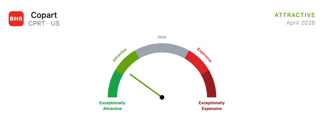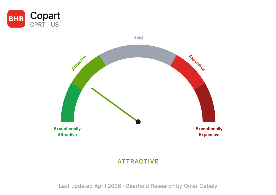 At the time of this report, with the stock trading at $33.06, the market is pricing Copart at approximately 16 years of discounted future cash flows. This is an approximation, not an exact calculation. The assumptions embedded in our model are consistent with the company’s current and historical operating performance, they are not heroic, and they are not pessimistic. This figure is monitored and updated on a monthly basis as the stock price and business performance evolve. This places the business in the Attractive zone of the valuation gauge.