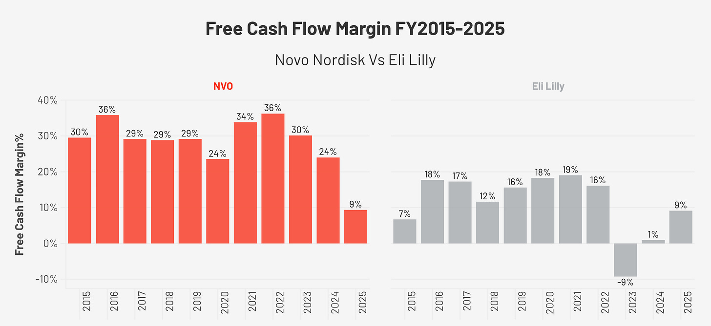 On financial quality, Novo Nordisk maintains the structural advantage. Its gross margin averaged approximately 83.9% from 2015 through 2024, falling to 81.0% in FY2025, compared to Eli Lilly’s expansion from 74.8% in 2015 to 83.0% in FY2025. Lilly has only just reached the margin level that Novo Nordisk has sustained for a decade. Operating margins tell the same story: Novo Nordisk’s range of 41.3% to 45.8% throughout the decade versus Lilly’s expansion from 18% in 2015 to 45.6% in FY2025. Both companies are now experiencing the same capex-driven FCF (free cash flow) compression, Lilly’s FCF margin was 9.2% in FY2025 versus Novo Nordisk’s 9.4%, as both build manufacturing infrastructure for the same market opportunity. On leverage, Novo Nordisk is more conservatively capitalised at 0.68x debt-to-equity versus Lilly’s 1.60x.