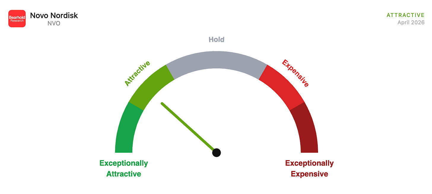 At $37.50 and 17 years of embedded cash flows, the price sits in the Attractive zone of the Bearhold valuation framework. The business I have described in this report is exceptional. The near-term headwinds, negative 2026 guidance, China patent expiry, the capex cycle compressing free cash flow, the CEO transition, are all real and all visible in the numbers. None of them concern me as a long-term investor. What keeps Novo Nordisk on the Watchlist rather than in the Approved column is not weakness. It is the honest acknowledgment that the most important competitive chapter of this company’s modern history is being written right now, in real time, with the outcome still genuinely uncertain. I will be watching that chapter closely. And when the evidence confirms what the insulin franchise already demonstrated about this company’s ability to build and defend category leadership, the designation will change.