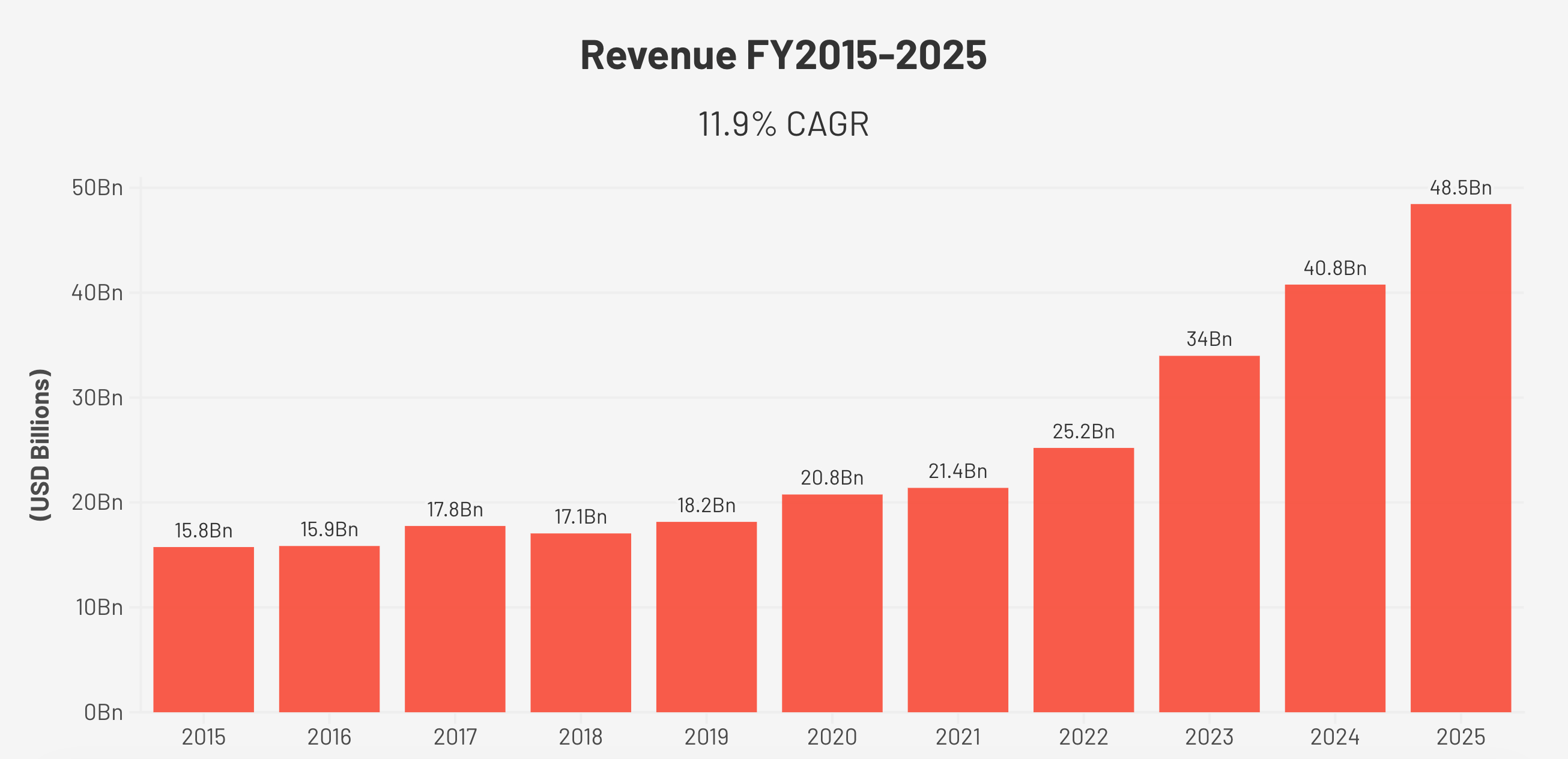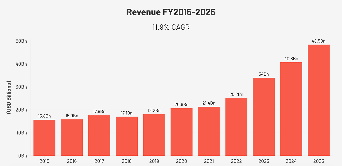 Revenue grew from $15.7 billion in FY2015 to $48.5 billion in FY2025, a compound annual growth rate of approximately 11.9% over ten years. The growth was not linear. Through 2021, the diabetes franchise expanded steadily. Then the GLP-1 obesity inflection arrived: from 2022 onwards, the company added roughly seven to nine billion dollars of revenue per year. The 2025 figure is more than three times the 2015 base.