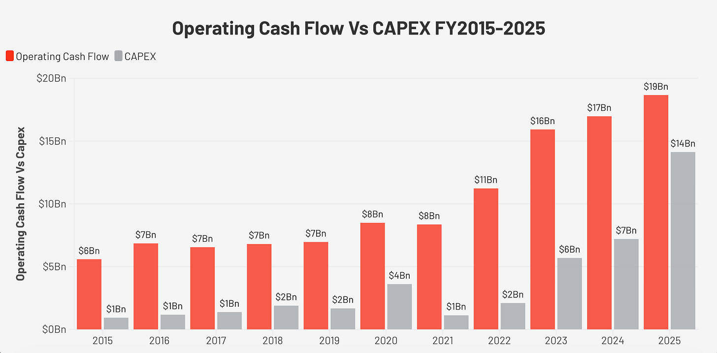 Diluted EPS grew from $0.99 in FY2015 to $3.61 in FY2025, a compound annual growth rate of 13.8%. This is the number I trust most as a proxy for earnings power, because it is clean, consistent, and not distorted by the current capex cycle. The share count declined from 5,155 million to 4,448 million over the decade, a consistent buyback programme that reduces the per-share denominator. Dividends per share grew from $0.37 in 2015 to $1.82 in 2025.